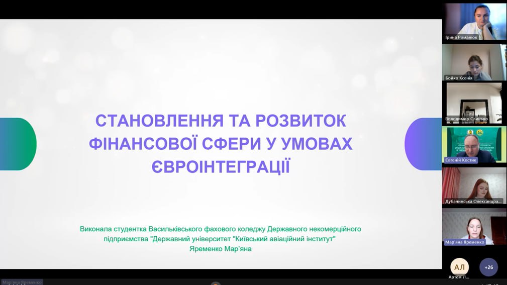 Тему «Становлення та розвиток фінансової сфери в умовах євроінтеграції» обґрунтувала здобувачка першого (бакалаврського) рівня вищої освіти, спеціальність «Менеджмент», Васильківський фаховий коледж «Державного університету «КАІ» Мар’яна Яременко, в якій констатувала, що у центрі уваги стоїть адаптація української фінансової системи до стандартів та практик ЄС, зокрема модернізація регуляторної бази, підвищення макроекономічної та фінансової стабільності, розвиток ринків капіталу та підвищення довіри інвесторів.
