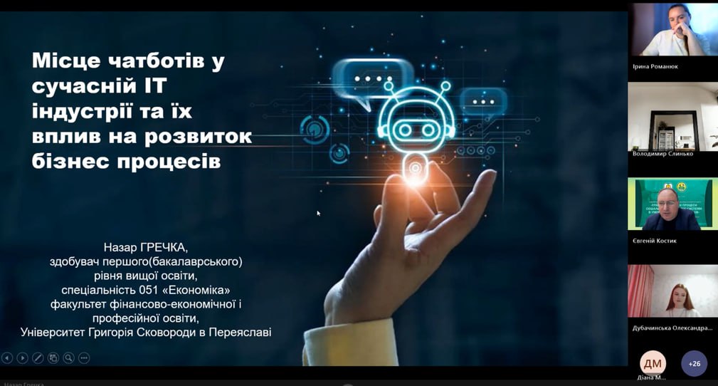 «Місце чат-ботів у сучасній IT-індустрії та їх вплив на розвиток бізнес-центрів» у своїй доповіді розкрив здобувач першого (бакалаврського) рівня вищої освіти, спеціальність 051 «Економіка», факультет фінансово-економічної і професійної освіти, Університет Григорія Сковороди в Переяславі Назар Гречка, де зазначив, що місце чат-ботів у сучасній ІТ-індустрії є ключовим через їхню здатність автоматизувати взаємодію з користувачами, пришвидшувати обробку запитів і знижувати навантаження на людські ресурси. Чат-боти стали ефективним інструментом, що не лише відповідає на типові питання клієнтів у режимі 24/7, а й завдяки штучному інтелекту аналізує поведінку користувачів, надає персоналізовані рекомендації та підтримує продажі. Вони зменшують час відповіді та підвищують рівень задоволення клієнтів, водночас оптимізуючи бізнес-процеси і знижуючи витрати на обслуговування.