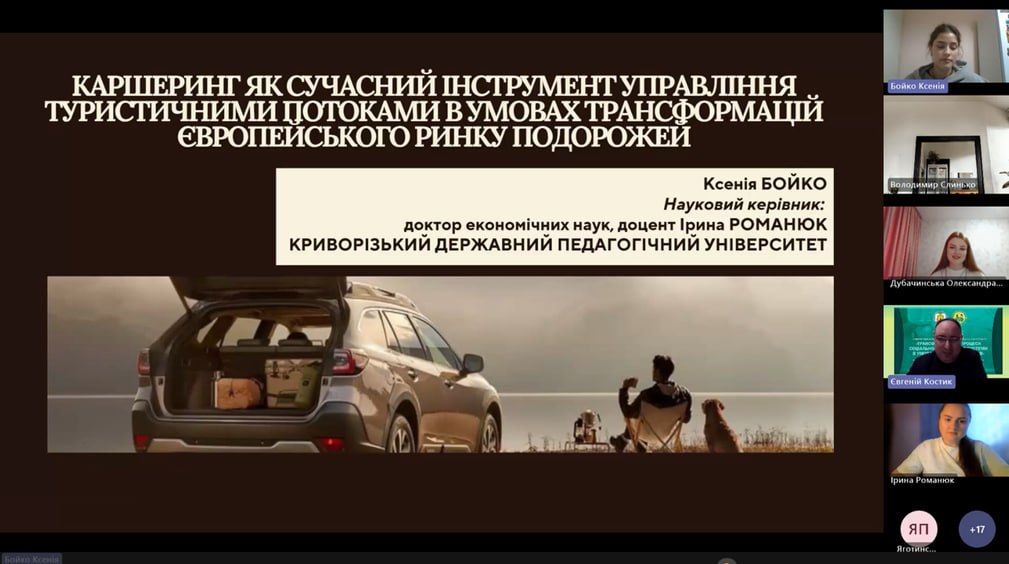 Здобувачка першого (бакалаврського) рівня вищої освіти, спеціальність 242 «Туризм і рекреація», факультет географії, туризму та історії, Криворізький державний педагогічний університет Ксенія Бойко у своєму виступі розкрила каршеринг як сучасний інструмент управління туристичними потоками в умовах трансформацій європейського ринку подорожей. Дослідниця зазначила, що каршеринг як сучасний інструмент управління туристичними потоками у контексті трансформацій європейського ринку подорожей досліджується як інноваційний засіб мобільності, який сприяє більш ефективному розподілу туристів і зменшенню транспортного навантаження на міста. У ході трансформацій європейського ринку подорожей ключову роль відіграє цифровізація та сталий розвиток, де каршеринг забезпечує гнучкість пересування туристів, знижує потребу у приватних автомобілях, а отже зменшує шкідливі викиди і транспортні затори. Це особливо актуально для популярних туристичних міст, де традиційне управління потоками стикається з викликами перенасичення. Каршеринг інтегрується з цифровими платформами, що забезпечують координацію маршрутів і години пік у режимі реального часу, що дозволяє оптимізувати туристичні потоки і підвищувати якість обслуговування. Це також відкриває нові можливості для розвитку екологічно дружніх маршрутів і сприяє привабливості регіонів, які прагнуть стати конкурентоспроможними на туристичному ринку.