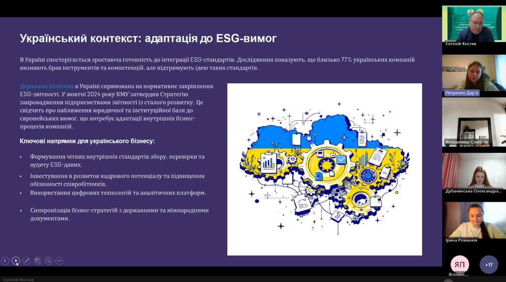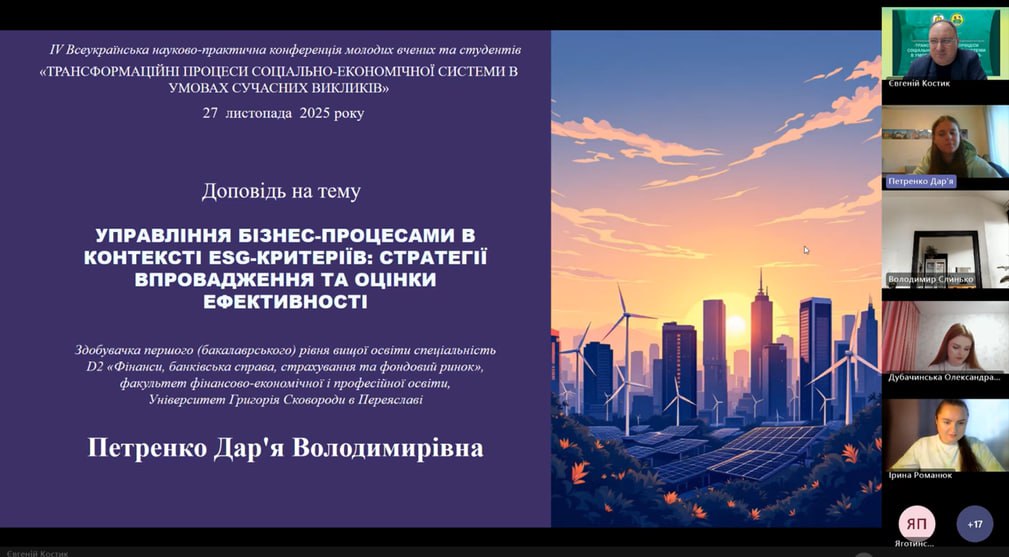 Проблему управління бізнес-процесами в контексті ESG-критеріїв, у своєму виступі розкрила здобувачка першого (бакалаврського) рівня вищої освіти спеціальність D2 «Фінанси, банківська справа, страхування та фондовий ринок», факультет фінансово-економічної і професійної освіти, Університет Григорія Сковороди в Переяславі Дар’я Петренко. Дослідниця наголосила, що управління бізнес-процесами в контексті ESG-критеріїв передбачає поєднання інституційних реформ, фінансових механізмів, внутрішньокорпоративних практик та технологічних інновацій. Важливим підтвердженням цього є логіка розвитку світових рейтингів, зокрема MSCI ESG Ratings, які разом із регуляторними ініціативами ЄС формують нові стандарти прозорості й відповідальності та визначають важливі орієнтири для компаній на міжнародному ринку. У такому середовищі український бізнес перебуває на етапі адаптації до вимог сталого розвитку, що зумовлює необхідність модернізації внутрішніх бізнес-процесів, створення ефективних систем збору та верифікації ESG-даних, а також посилення кадрового й технологічного потенціалу. Ці тенденції тісно пов’язані з нормативними та стратегічними документами, ухваленими на національному рівні, які створюють базові умови для інтеграції ESG-принципів у практику управління. Доповненням до цього виступають фінансово-інвестиційні інструменти, зокрема «зелені» облігації та податкові стимули, що відкривають нові можливості для залучення капіталу та підтримки інноваційних проєктів. У перспективі саме взаємодія нормативного забезпечення, фінансових стимулів і технологічних рішень здатна забезпечити системну трансформацію бізнес-процесів та водночас посилити конкурентоспроможність компаній у глобальному економічному середовищі.