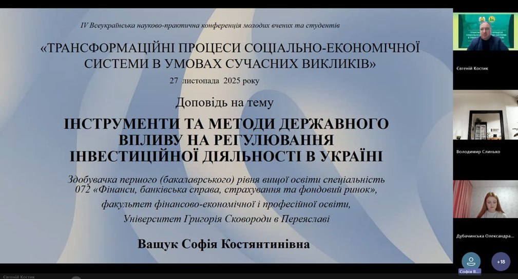 Здобувачка першого (бакалаврського) рівня вищої освіти, спеціальність 072 «Фінанси банківська справа, страхування та фондовий ринок», факультет фінансово-економічної і професійної освіти, Університет Григорія Сковороди в Переяславі Софія Ващук дослідила тему «Інструменти та методи державного впливу на регулювання інвестиційної діяльності в Україні», де зазначила, що інструменти та методи державного впливу на інвестиційну діяльність формують комплексний механізм реалізації ДІП, а відтак, ефективність залежить від: гнучкості та адаптивності інструментів; інтеграції цифрових технологій; балансу між прямим і непрямим впливом; врахування ESG та воєнних ризиків. Для України пріоритетами є: розширення ППП, цифровізація процесів, страхування ризиків, розвиток індустріальних парків. Успіх залежить від стабільності правового поля, прозорості та партнерства держави й бізнесу.