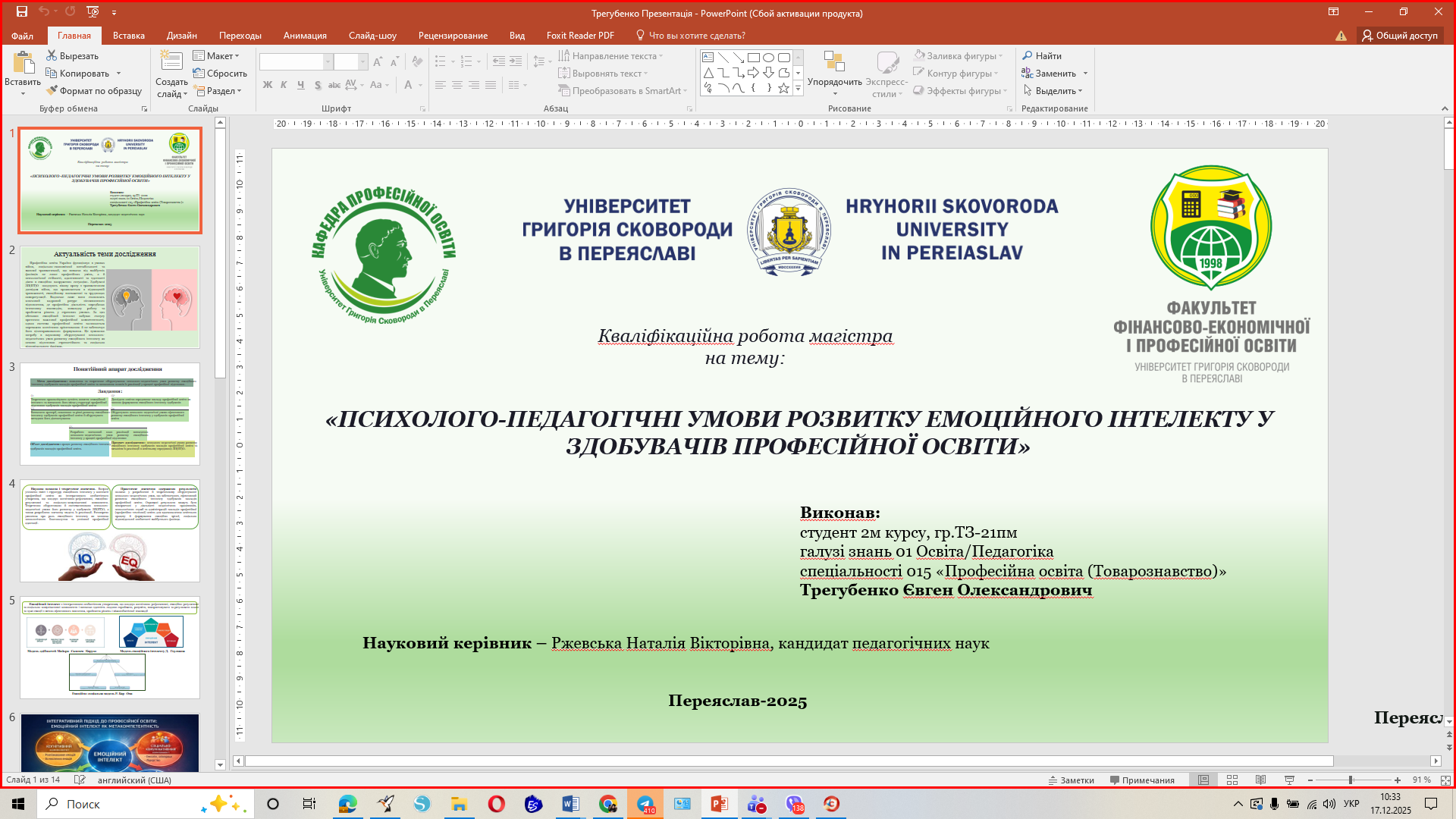 17 грудня 2025 року на кафедрі професійної освіти факультету фінансово-економічної і професійної освіти Університету імені Григорія Сковороди в Переяславі відбувся фінальний етап магістерської підготовки – захист кваліфікаційних робіт здобувачів другого (магістерського) рівня вищої освіти за спеціальністю 015 «Професійна освіта (Товарознавство)».