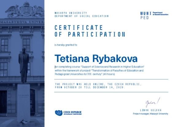 В жовні-грудні 2020 р. викладачі кафедри доц.. Кучеренко С.Ю. та доц.. Рибакова Т.О. прийняли участь в Міжнародному проекті «Зміни педагогічних факультетів   та   університетів   у   21   столітті»,   що реалізував Університет імені Масарика (м. Брно, Чехія) за підтримки Чеської агенції розвитку за напрямами «Підтримка науковців та підвищення їхньої академічної мобільності» та «Підвищення якості вищої освіти». За підсумками проекту викладачами було проведено семінари для науково- педагогічних працівників нашого факультету.