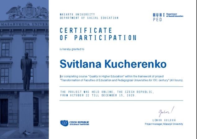 Ковтун О.А., Кучеренко С.Ю., Костик Є.П., Леваєва Л.Ю., Паламарчук О.М. – отримали сертифікати за участь в Міжнародному онлайн-курсі Тенденції педагогічної освіти (нові підходи, інтернаціоналізація та академічного письма) в рамках проекту «Зміцнення потенціалу педагогічних вищих навчальних закладів України» за підтримки Чеського університету імені Г. Масарика з 4 жовтня по 22 листопада 2023 року.